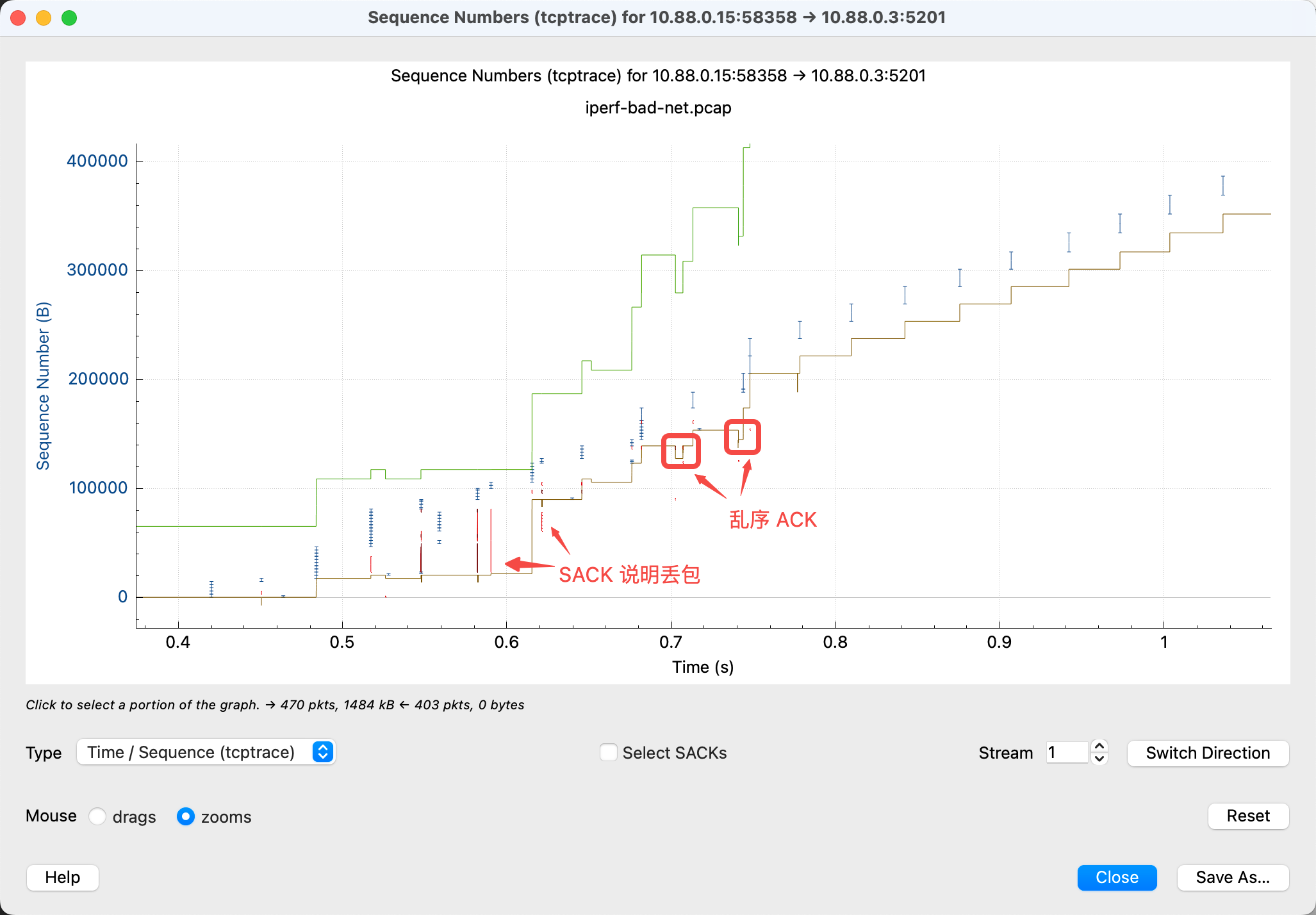 - 看到红色的 SACK 线,说明接收方有包没收到
